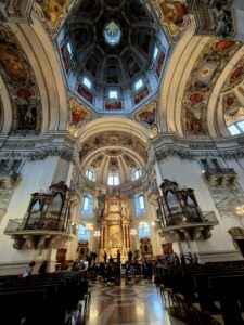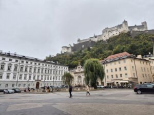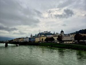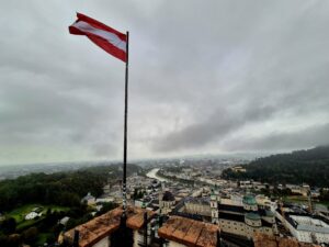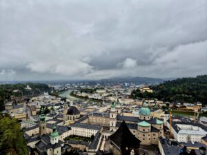 다음은 잘츠부르크 대성당 (Dom zu Salzburg)으로 향했어요. 모차르트가 세례를 받았던 곳이고, 2층에는 그가 직접 연주했던 오르간이 남아 있어요. 그다음엔 유럽에서 가장 큰 중세 성 중 하나인 호엔잘츠부르크 성(Festung Hohensalzburg)으로 갔어요. 잘츠부르크 카드 덕분에 산악열차도 무료로 타고, 대부분 박물관도 다 이용 가능했어요. 성 꼭대기 전망대에서 오스트리아 국기랑 사진 도 찍고, 진짜 경치가 미쳤어요 📸